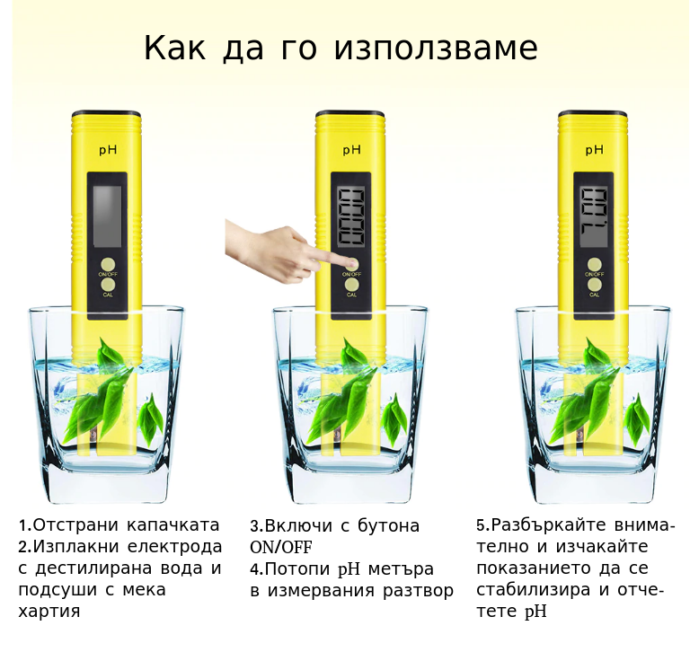 pH метърът да се включи с бутона "ON / OFF", електродът да се потопи в тестваната течност. Внимателно да се разбърка, докато показаната стойност се стабилизира.