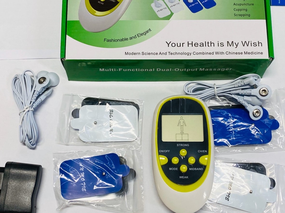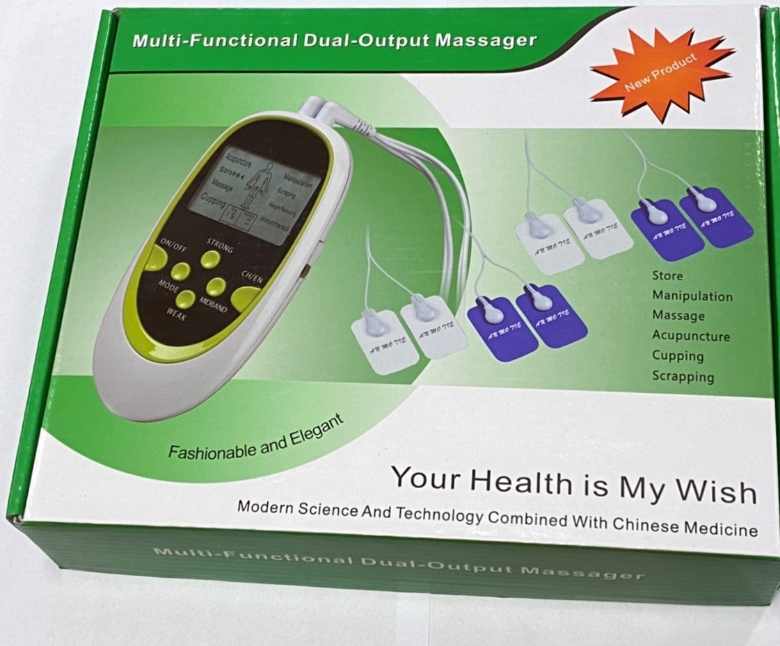 Електроимпулсен масажор - преносим тип, подходящ за хора, които пътуват, контрол на процедурите с дистанционно управление с удобен голям LCD дисплей - Възможност за избор между 6 автоматични програми, всяка с продължителност 15 минути - 8 активни масажни зони - 4 чифта електроимпулсни самозалепващи се електрода за локална "АШИ" физиотерапия и електро акупунктура.