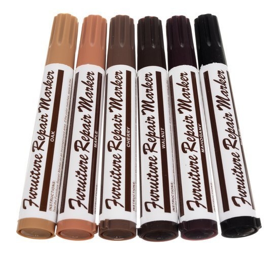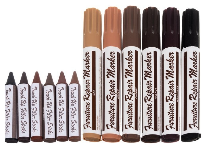 Маркери за поправка на драскотини по повърхности – малки повреди, драскотини по повърхността вече могат лесно да бъдат поправени с нашия комплект за ремонт на мебели. Ремонтът се извършва чрез запълване на по-дълбоката кухина с восък и изчертаване на структурата на дървото с подходящ цвят на маркера. Комплектът ви позволява бързо да поправите сами повредени панели, мебели, врати и други изделия от дърво и материали на дървесна основа. След като използвате комплекта за ремонт, не е нужно да чакате, докато всичко изсъхне. Маркерите изсъхват бързо. Но това не е всичко, покритието в зоната за ремонт е устойчиво на надраскване. Подложката под формата на полутвърд восъчен пастел е лесна за нанасяне, цялата е завършена с маркер от същия цвят съдържа мастило на маслена основа, което е устойчиво на измиване. Гарантира дълготраен ефект. Богат набор от цветове, включени в комплекта до 6 различни: дъб, череша, махагон, клен, орех, черен. Можете да го използвате за мебели в светли, тъмни и средни цветове. Комплектът включва – 6 маркера, 6 восъчни пастели.
