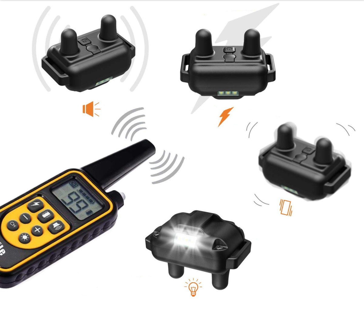 Този електронен нашийик за куче е създаден, за да помогне на собствениците да тренират своите кучета ефективно и безопасно. Нашийникът може да се контролира от разстояние до 800 метра чрез дистанционното управление, което ви позволява да коригирате поведението на кучето ви без да се налага да се приближавате до него. Това е особено полезно при тренировки на открито или в големи дворове.
