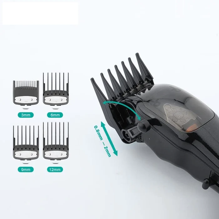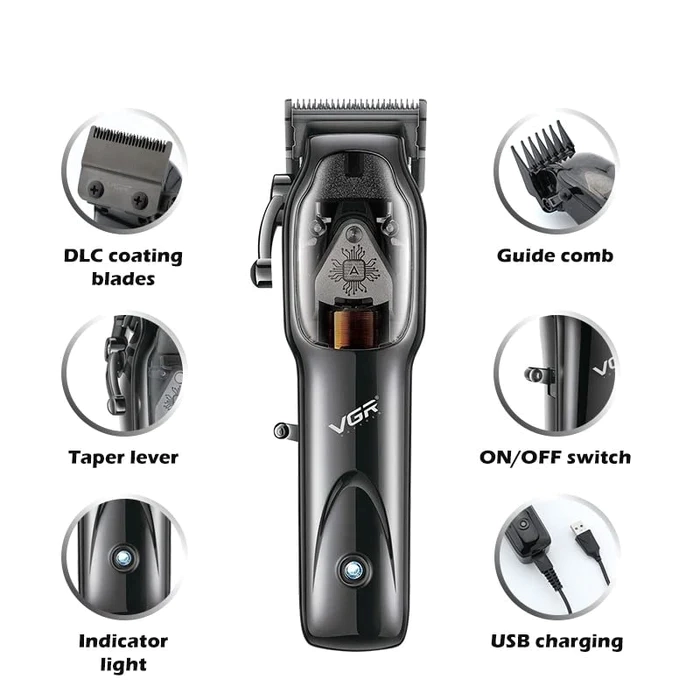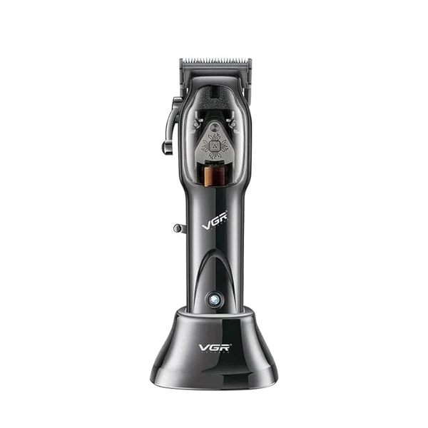 Професионална машинка за подстригване VGR V-002 е авангардна професионална машина за рязане, една от машините, проектирани с най-модерната технология на пазара. с автономност 100 мин. Проектиран с векторен двигател, той представлява еволюция на добре познатия магнитен двигател, така че когато натоварването на рязане се увеличи, мощността се увеличава, увеличавайки скоростта на рязане до 9000 RPM. Предлага ефективност на рязане и несравнимо изживяване за перфектно избледняване. Включва гребен, четка за почистване, стойка за зареждане и 6 първокласни скари.