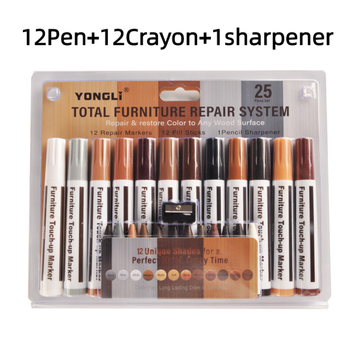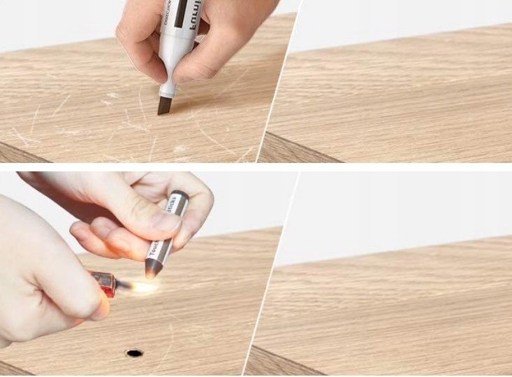 Маркери за поправка на драскотини по повърхности – малки повреди, драскотини по повърхността вече могат лесно да бъдат поправени с нашия комплект за ремонт на мебели. Ремонтът се извършва чрез запълване на по-дълбоката кухина с восък и изчертаване на структурата на дървото с подходящ цвят на маркера. Комплектът ви позволява бързо да поправите сами повредени панели, мебели, врати и други изделия от дърво и материали на дървесна основа. След като използвате комплекта за ремонт, не е нужно да чакате, докато всичко изсъхне. Маркерите изсъхват бързо. Но това не е всичко, покритието в зоната за ремонт е устойчиво на надраскване. Подложката под формата на полутвърд восъчен пастел е лесна за нанасяне, цялата е завършена с маркер от същия цвят съдържа мастило на маслена основа, което е устойчиво на измиване. Гарантира дълготраен ефект. Богат набор от цветове, включени в комплекта до 6 различни: дъб, череша, махагон, клен, орех, черен. Можете да го използвате за мебели в светли, тъмни и средни цветове. Комплектът включва – 6 маркера, 6 восъчни пастели.