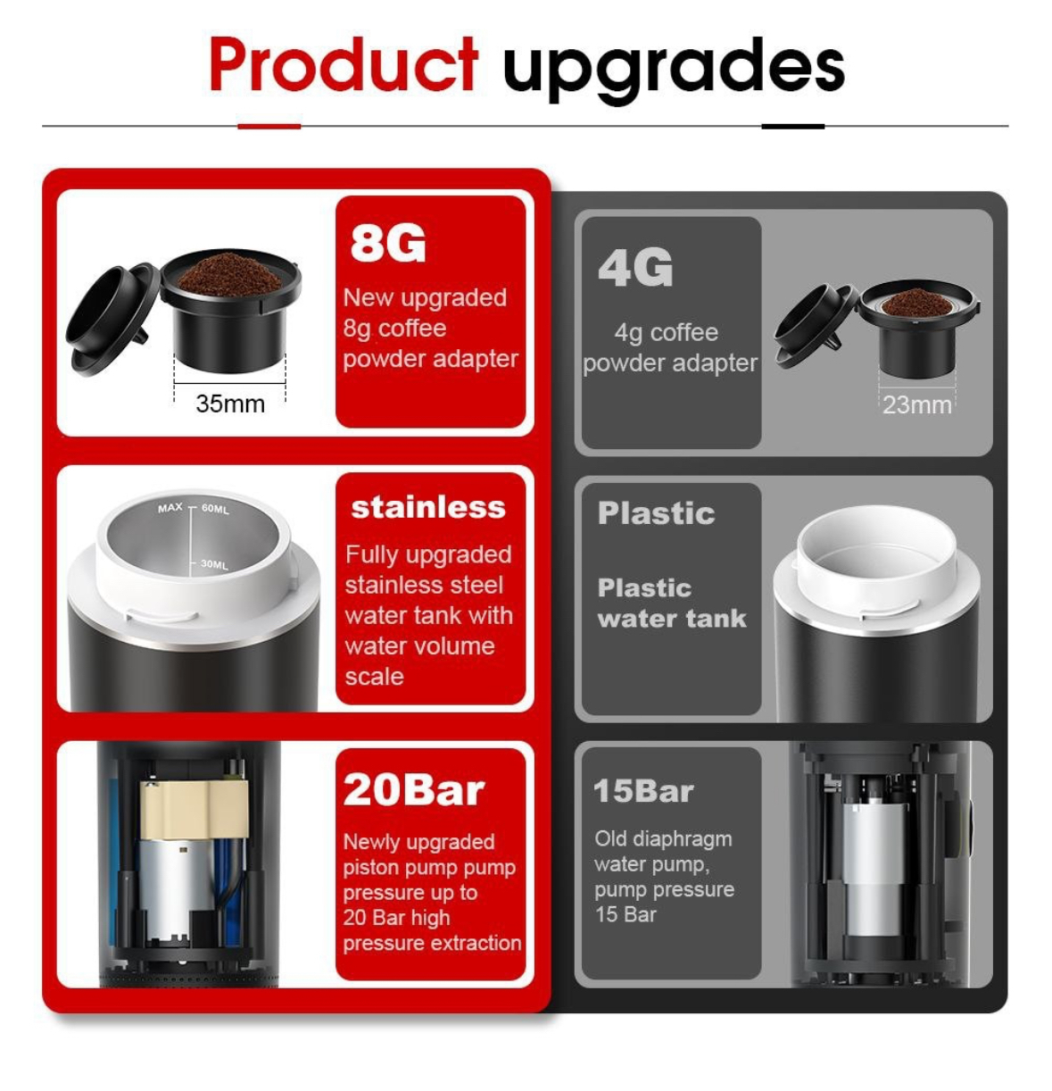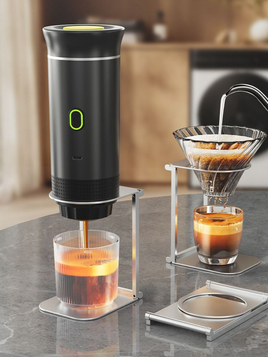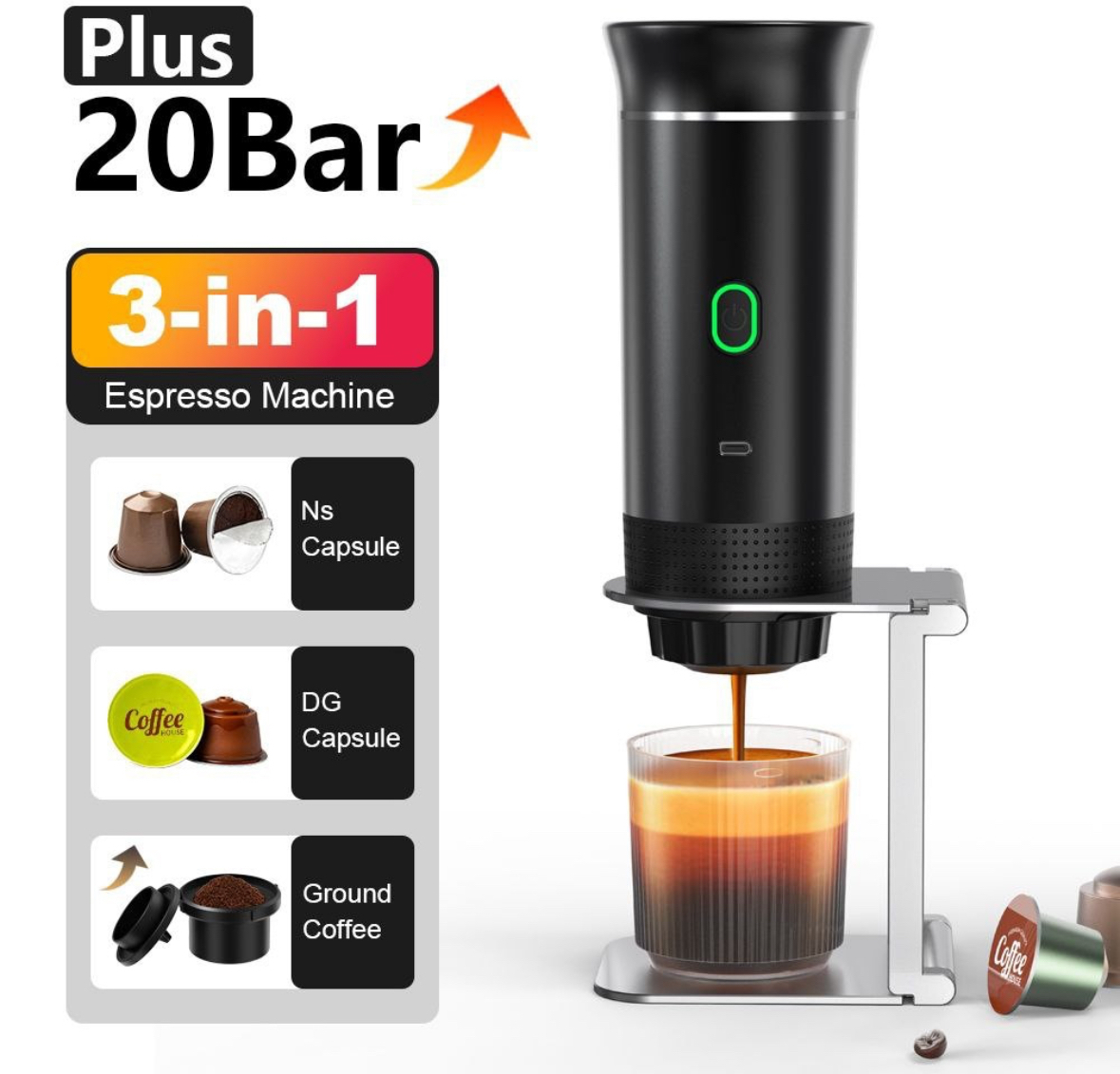 Компактна преносима кафе машина 3 в 1, съвместима с Nespresso, Dolce Gusto и насипно кафе. С мощна батерия (7500 mAh), налягане до 20 бара и USB-C зареждане, тя е идеална за пътуване, къмпинг или офис. Бързо приготвяне – само 20 сек. с гореща вода.