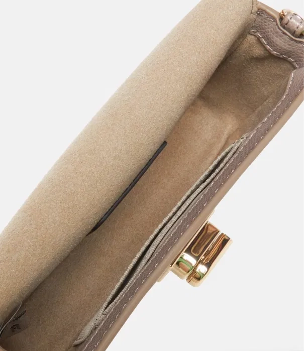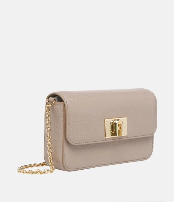 Дамската чанта Furla Crossbody в елегантен неутрален бежов / taupe цвят е перфектният аксесоар за жени, които ценят стил, качество и практичност. Изработена от висококачествена естествена кожа с фин релеф, чантата впечатлява със своя изискан външен вид и класически дизайн, който лесно се комбинира с всеки сезонен и ежедневен аутфит. Моделът е оборудван със стилно метално закопчаване в златист цвят, украсено с гравираното лого Furla, което подчертава неговия премиум характер. Леката и удобна златиста верижка позволява crossbody носене, осигурявайки комфорт и свобода на движение. Това е идеалната чанта за дами, които търсят оригинална Furla crossbody чанта, съчетаваща изтънчен дизайн, практична форма и високо качество.