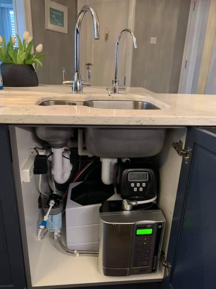 Това елиминира необходимостта от свързване на йонизатора за алкална вода директно към вашия стандартен кран. Батерията, проектирана за Kangen машини има елегантен чучур за алкална вода, въртящ се на 360°, както и специално проектиран чучур, който захранва киселинната вода.