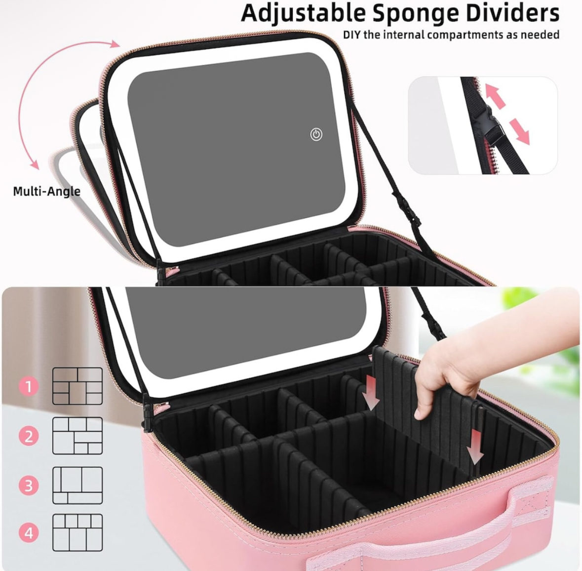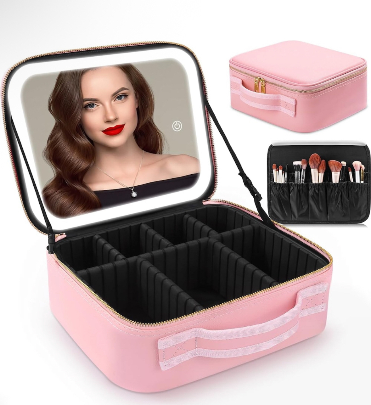 Луксозен несесер за грим с LED огледало – Компактен и стилен козметичен куфар с 3 режима на светлина, регулируема яркост и голямо огледало. Организирай козметиката си с 6 регулируеми разделителя и дъска за четки. Изработен от водоустойчива, устойчива и лесна за почистване синтетична кожа. Идеален за пътуване и перфектен подарък за всяка жена.