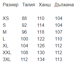 Размер 3XL:Талия-112см,Ханш-134см,Дължина-113см;