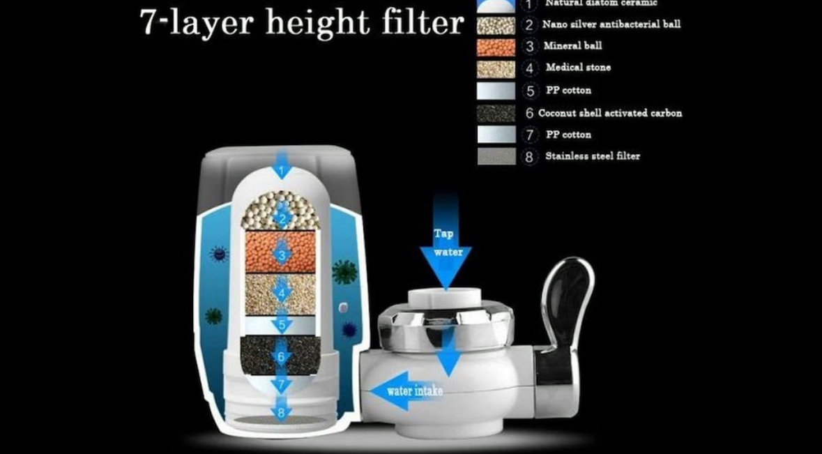 Компактен филтър за вода, предназначен за лесен монтаж директно на кухненската чешма. С 7 нива на пречистване и 5 активни филтъра (керамичен, Nano-KDF, активен въглен и др.), уредът ефективно премахва хлор, тежки метали, бактерии, ръжда, утайки и миризми.