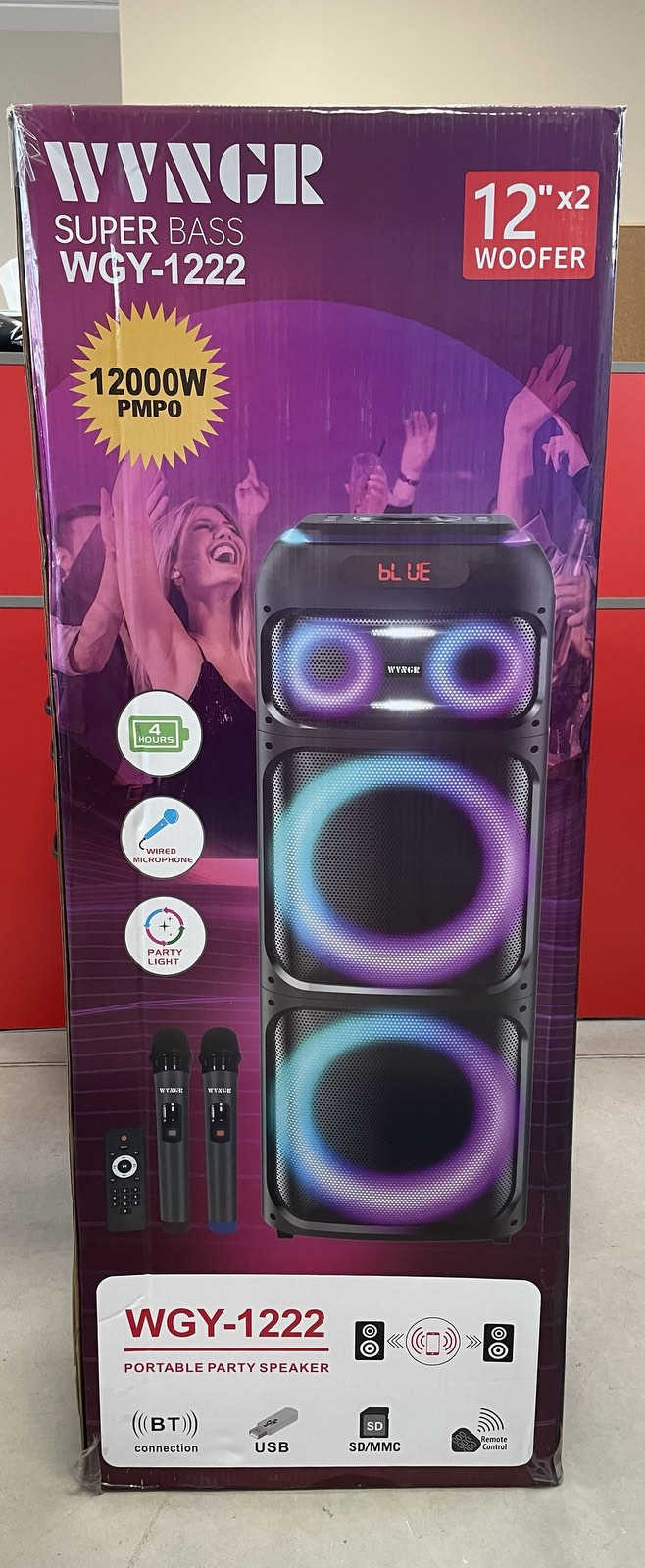 WANGR Super Bass WGY-1222 е мощна и стилна колонка, която ще ви впечатли със своя бас и качество на звука. С вградени технологии за усилен бас и оптимизирано аудио изживяване, тя предлага невероятна акустика за любителите на музиката и партитата. Тази колонка е идеална за всеки, който търси динамичен звук и мощни баси. С възможността за безжична връзка чрез Bluetooth, лесно можете да свържете вашите устройства и да се наслаждавате на музиката без кабели. Освен това WGY-1222 предлага и AUX вход, USB и SD слотове за още повече опции за възпроизвеждане. Вградената батерия с дълъг живот прави колонката идеална за външни събития и караоке сесии.