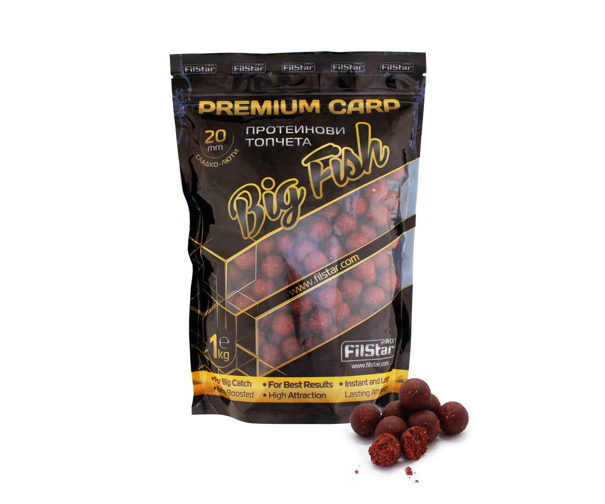 Протеинови топчета от серията Premium Carp на Filstar, притежават стимуланти и атрактанти, които ги правят лесно откриваеми и желани от трофейните екземпляри. Топчетата Big Fish са разработени за водоеми, където няма риболовна преса (засилено присъствие на риболовци). В състава си имат зърнени култури, рибни брашна, Robin Red, млечни протеини, животински протеини, овкусители и подправки със сладко-лютив вкус. Съдържат захари, витамини, минерали, стимуланти на апетита, а също и комбинация от амино профил. Перфектният баланс на използваните съставки спомага за лесното усвояване на храната без да засища рибата, като я кара да се завръща отново и отново на хранителното петно. Протеиновите топчета от серията Premium Carp ви осигуряват предимство и успех в риболова.