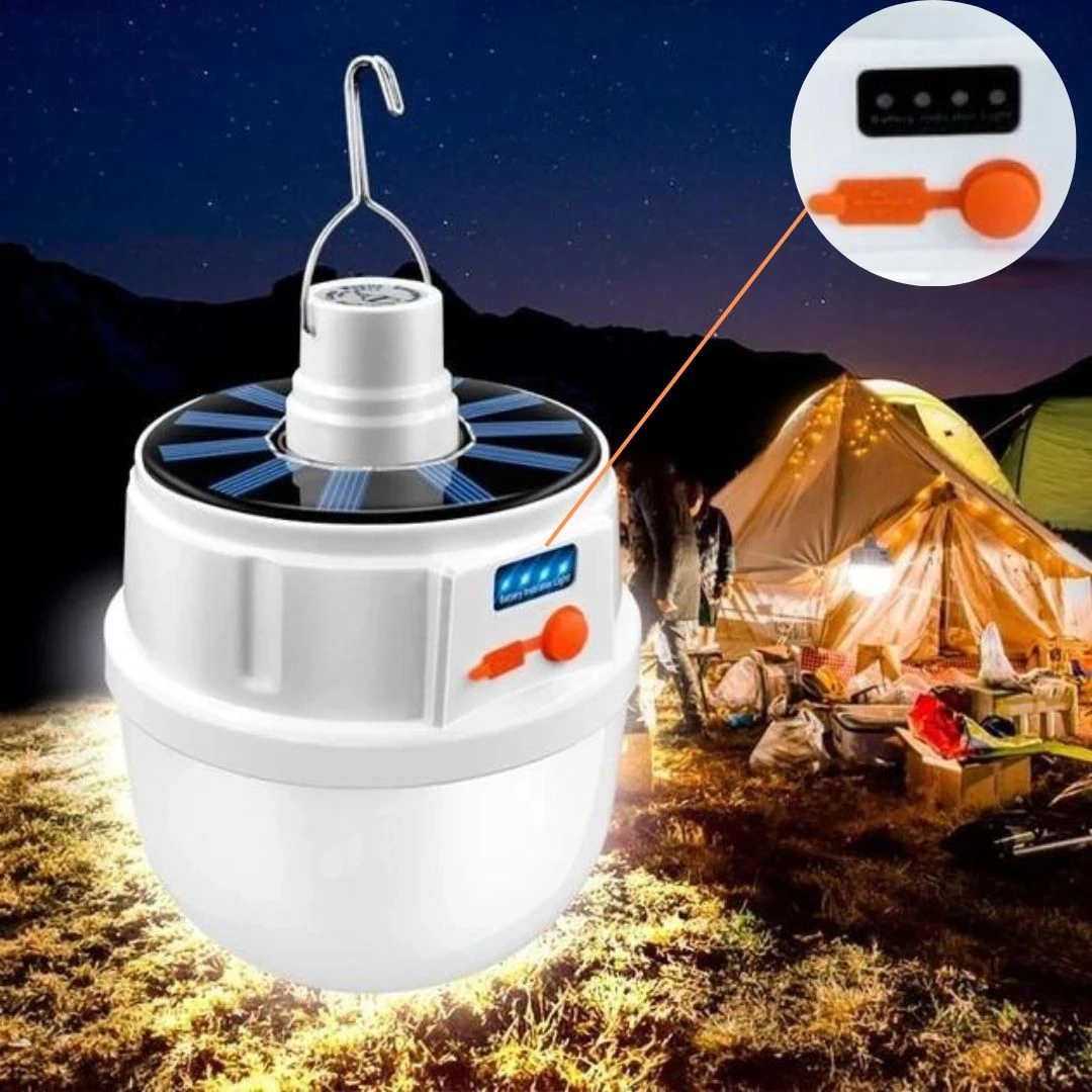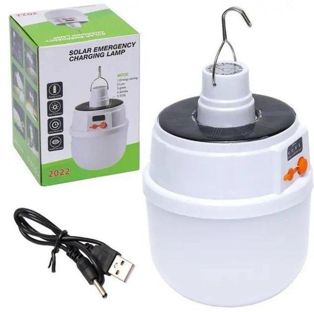 Соларна LED лампа модел 2022 – енергоспестяваща лампа с вграден соларен панел, USB зареждане и 3 режима на осветление. Подходяща за къмпинг, градина, двор, гараж и аварийно осветление. Зареждане от слънцето или мрежата, водоустойчива и издръжлива.