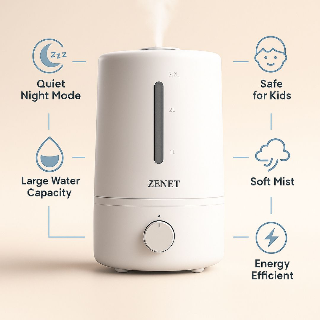 С ултразвуковия овлажнител Zenet ZET-414 ще постигнете не само подобряване на влажността на въздуха, но и ще намалите количеството прах, ще предотвратите изсушаването на кожата и ще облекчите респираторните проблеми. Този овлажнител е идеалното решение за създаване на здравословна среда във вашия дом или офис, особено през зимата, когато въздухът е по-сух, или през цялата година за поддържане на комфортен вътрешен климат.