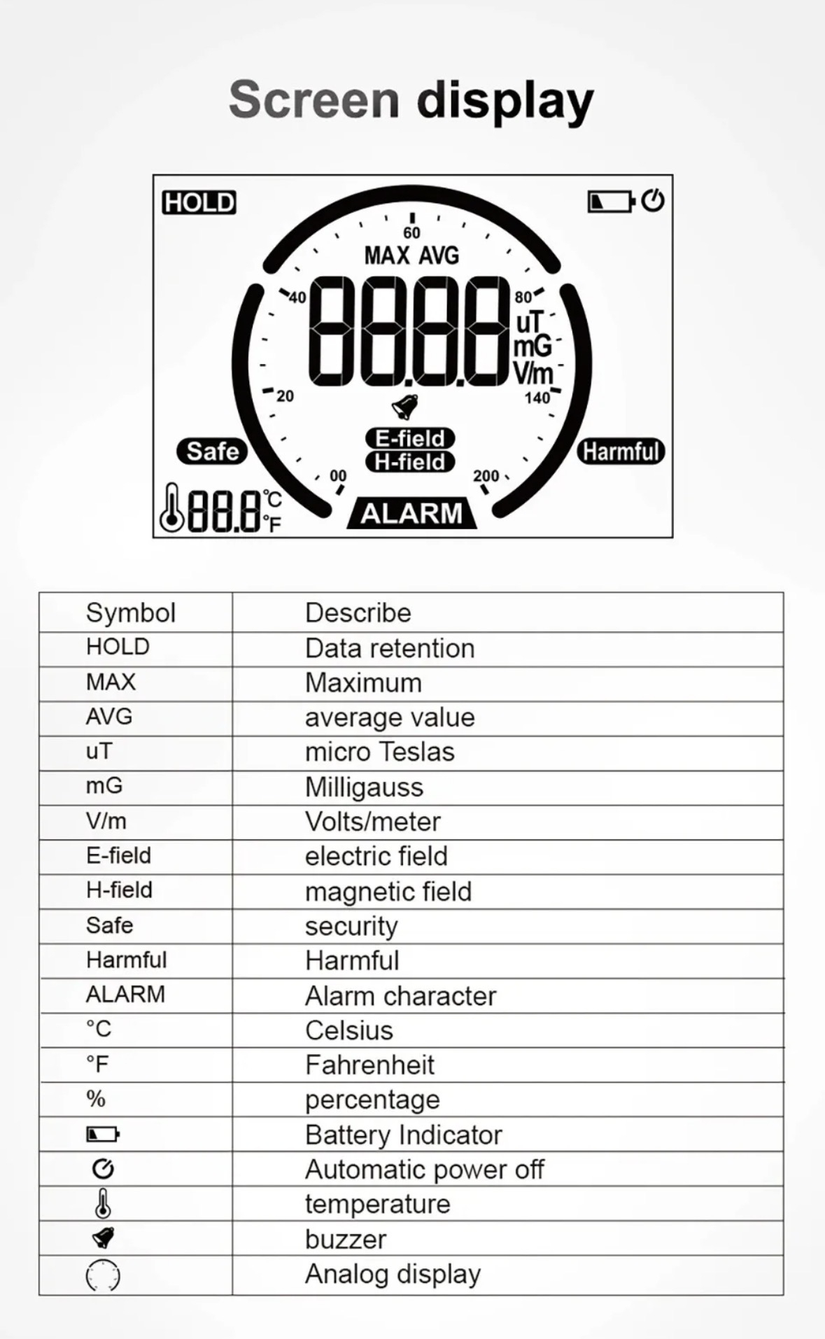 - Обхват на измерване: Vim:0~9999/uT:0~74/mG:0~740